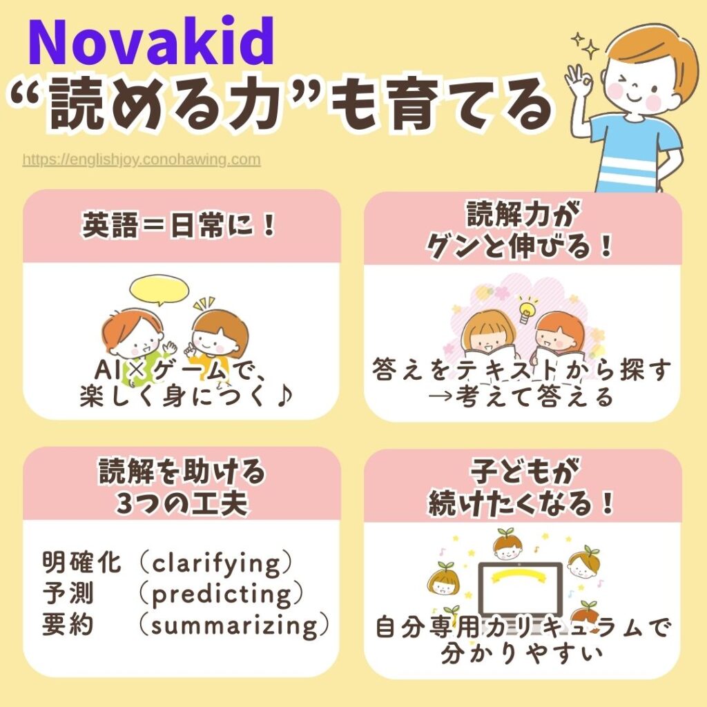 また、Novakidではただ単に文字を読むことを教えるだけでなく、内容を深く理解する「読解力(comprehension)」の育成にも力を入れています。