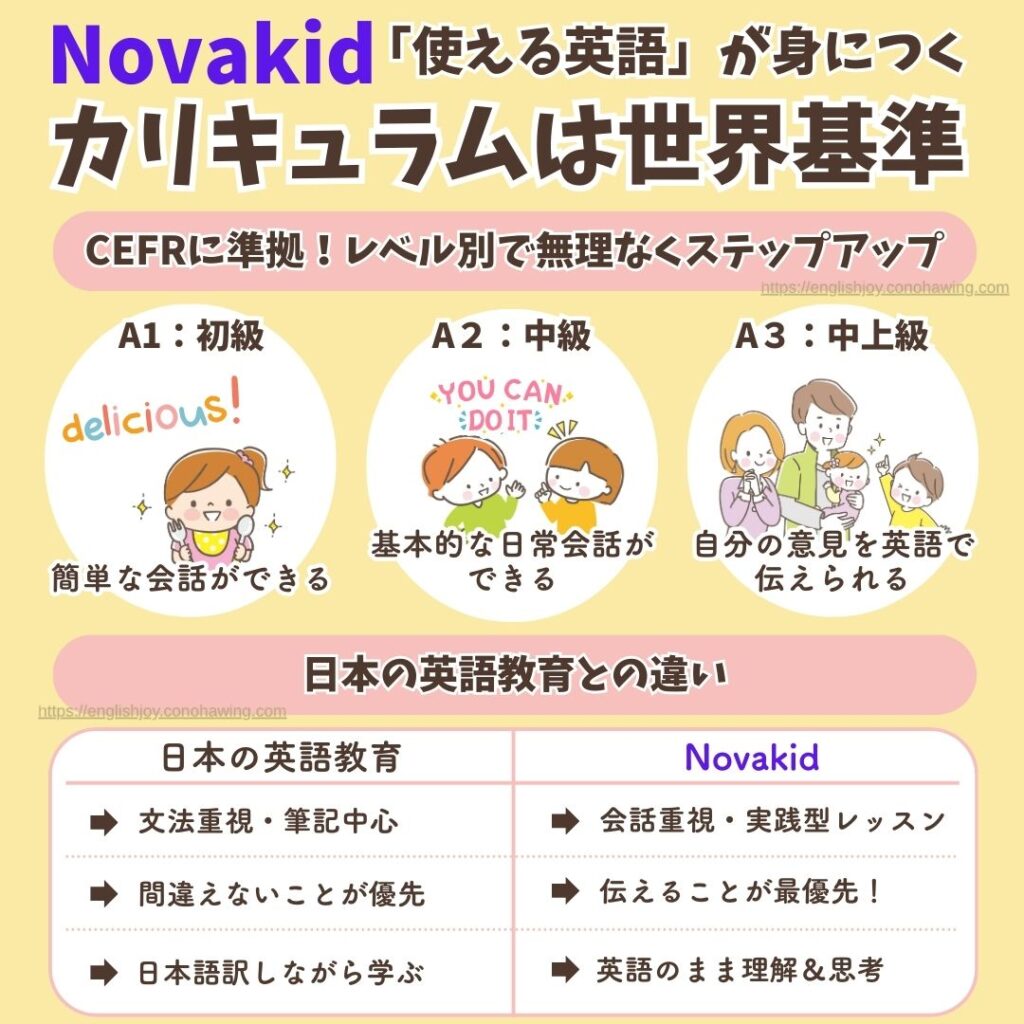 Novakidのカリキュラムは、CEFR(ヨーロッパ言語共通参照枠)に準拠しており、英語を「学ぶ」のではなく「英語で学ぶ」ことを重視しています。