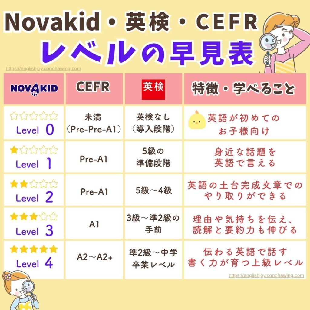 Novakidレベルと英検・CEFRの対応早見表