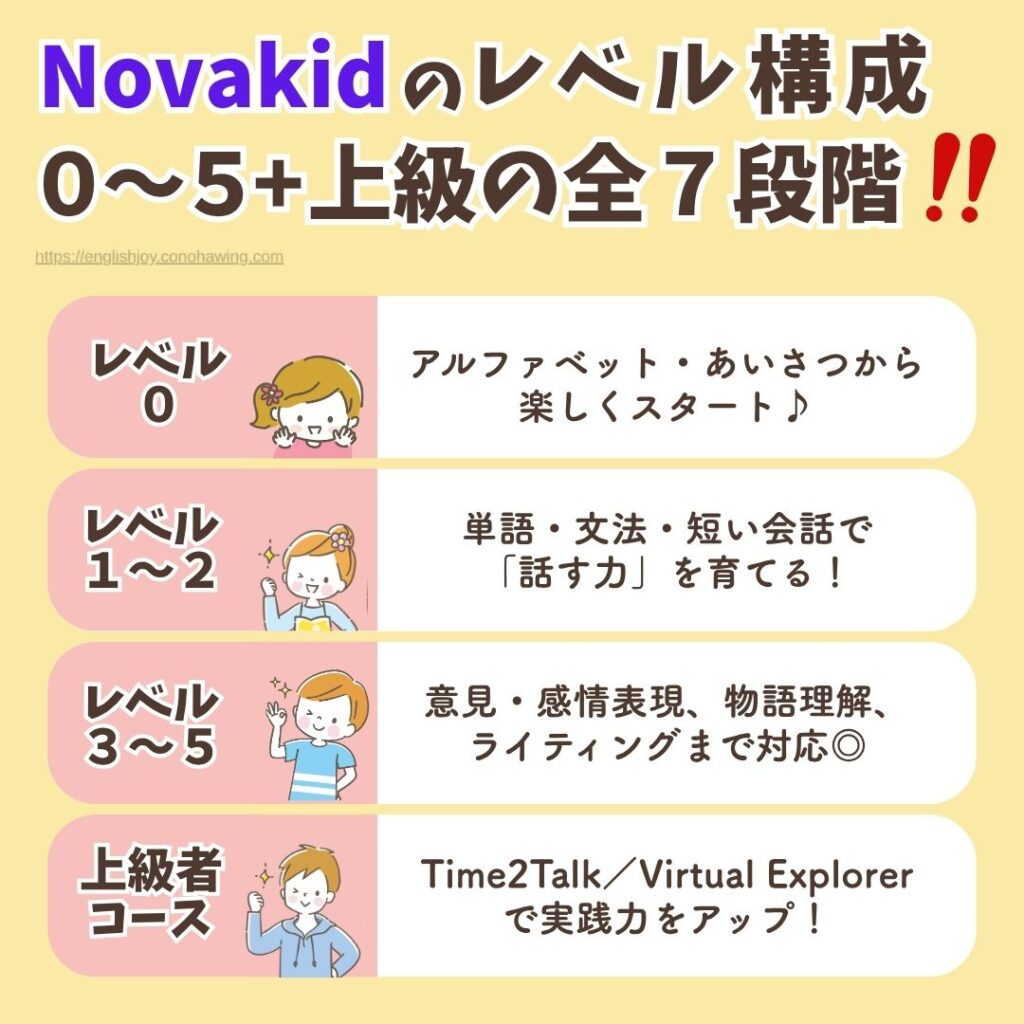 Novakidのレベル制度は、0〜5+上級コースの全7段階。
